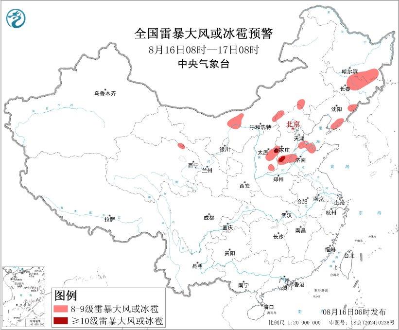 预计8月16日08时至17日08时,内蒙古中部、东北地区中部和南部、华北中南部等地的部分地区将有8级以上雷暴大风或冰雹天气,其中,山西东部、河北南部等地的部分地区将有10级以上雷暴大风;东北地区中南部、华北中南部、黄淮北部、西南地区东部、华南北部等地的部分地区将有小时雨量大于20毫米的短时强降水天气,其中,辽宁南部、河北中南部等地的部分地区小时雨量大于50毫米,最大可达70毫米以上。